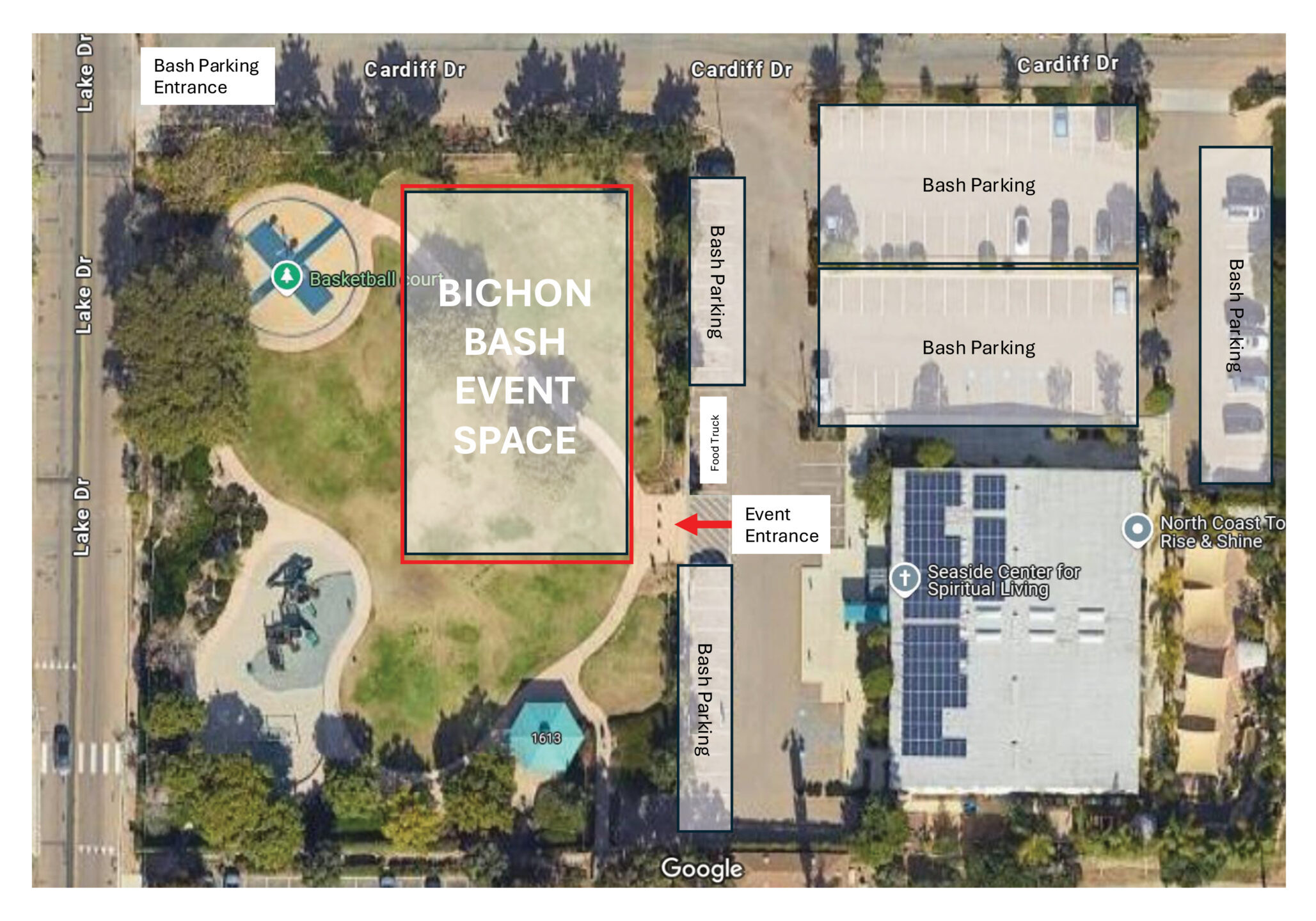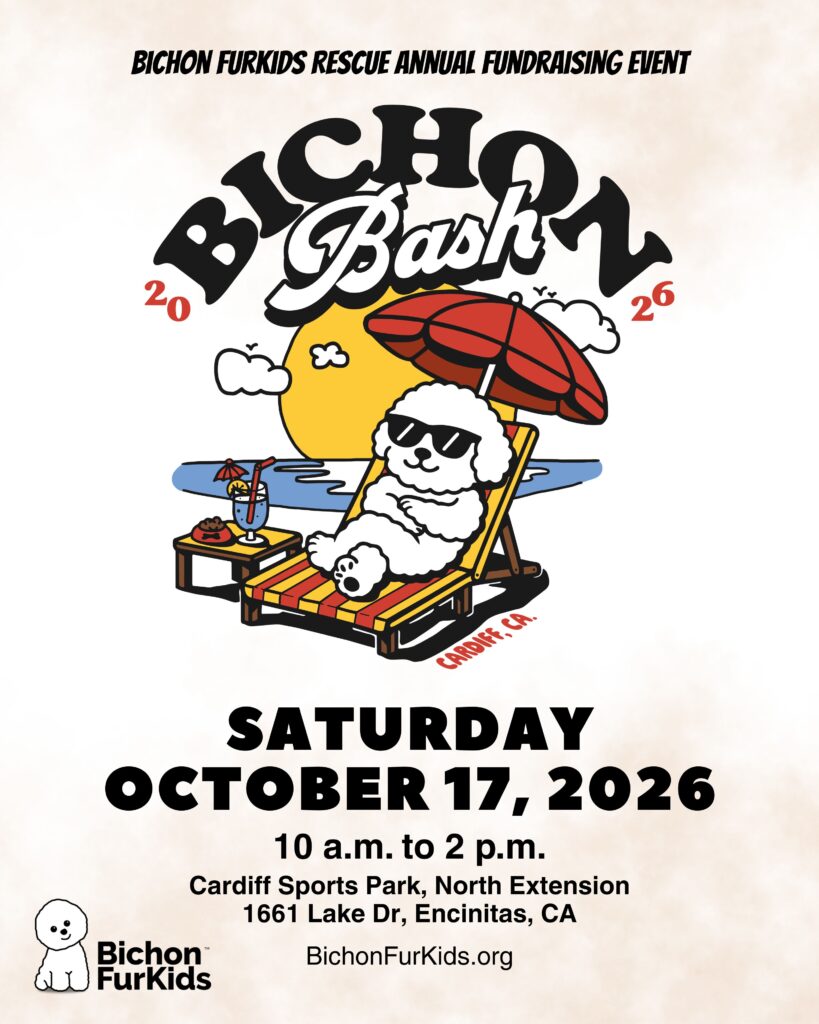 The countdown to the 2026 Bichon Bash has begun! We are excited to return to Cardiff Sports Park in Encinitas. There will be fenced-in event space for our furkids to play and designated parking for all of the event attendees at the Spiritual Living Center near the park.