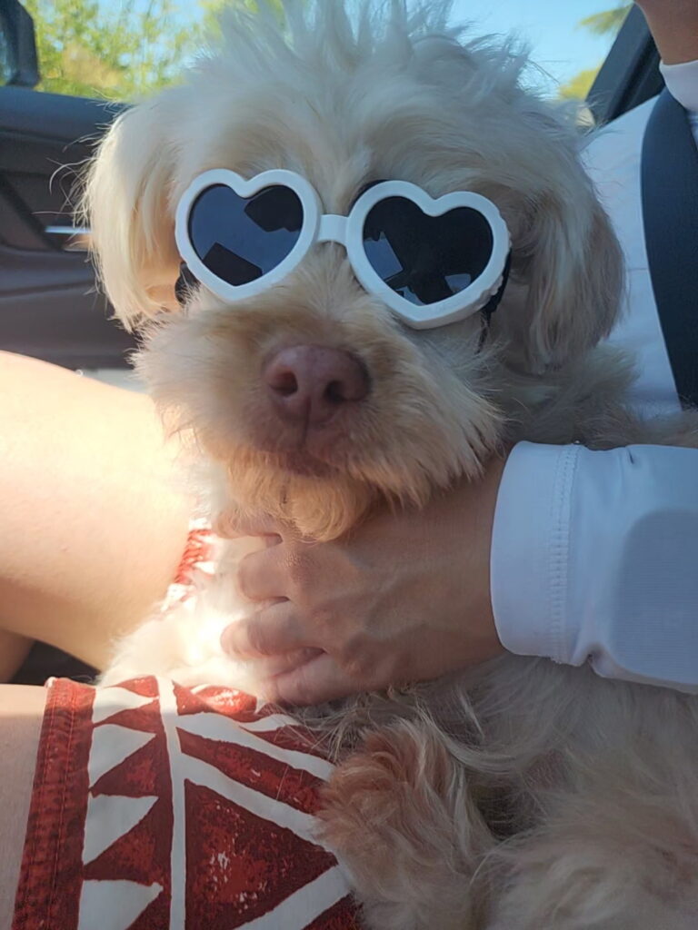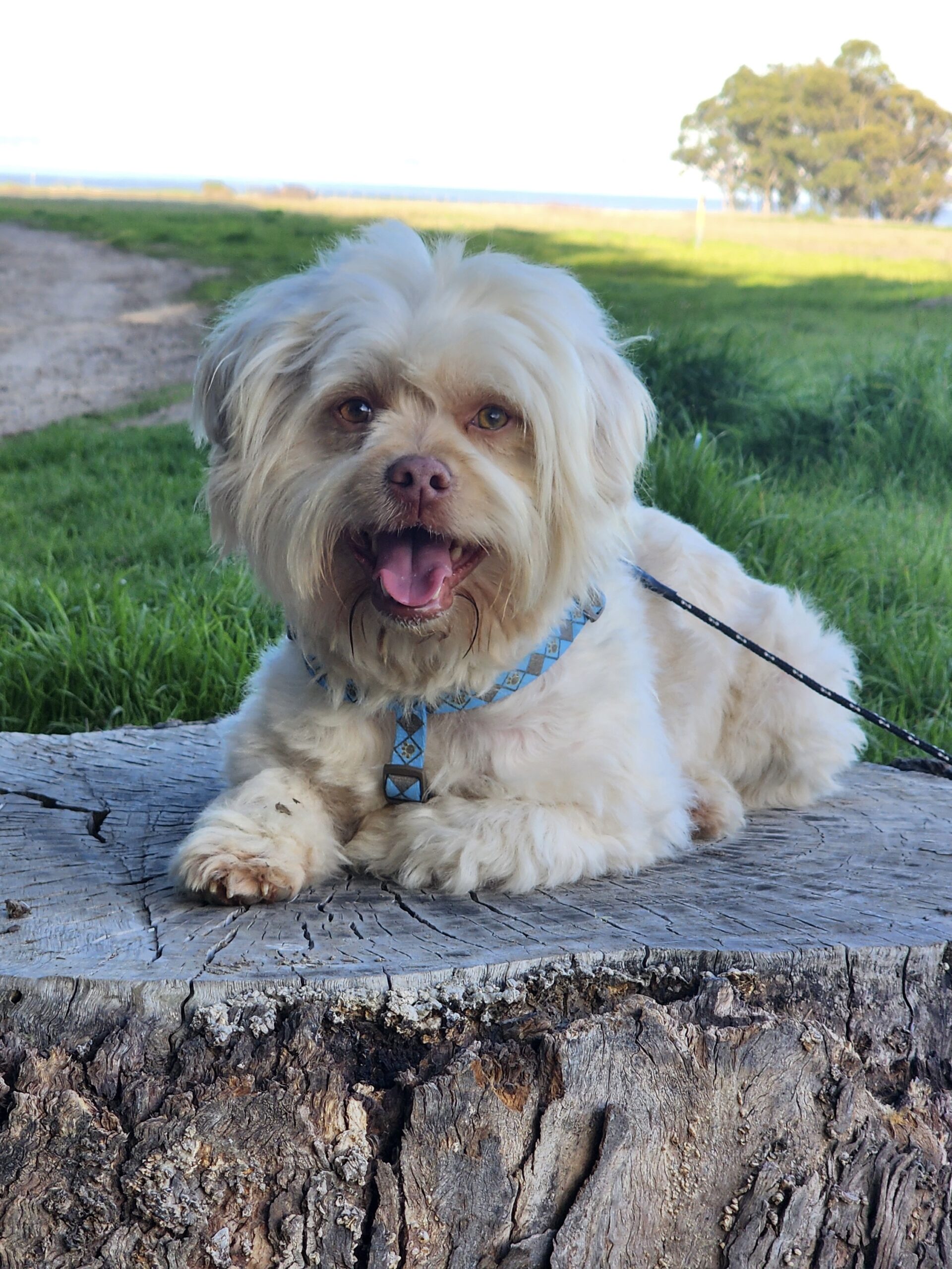 My name is Gregarious Georgie, and I’m a loving, cuddly, and affectionate pup who is a bichon/Maltese mix that is four years old and lots of fun! I have silky cream-colored hair with apricot coloring around my eyes and mouth, expressive brown eyes, and a perpetual smile.