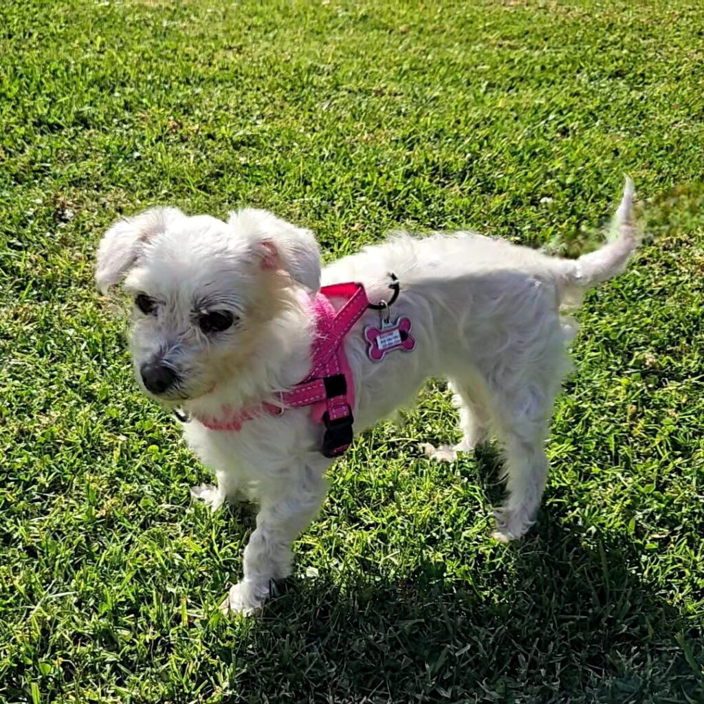 I love treats (soft, chewy ones especially!) and will happily do just about anything for them! After I go outside to potty, I immediately come back over to be picked up — because why walk when you can be carried like a little princess? My foster Mom, however, says that I’m learning to walk on a leash, but truthfully, while I can do that, I much prefer being held. My tiny size makes me the perfect companion, and I’m always happy to go wherever you go.