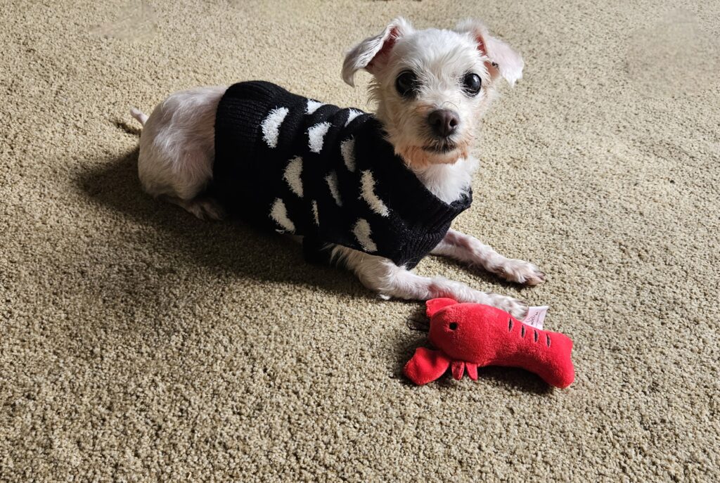 I’m a mellow little pup who knows how to relax. I love belly rubs, gentle brushing, soft blankets, and being cozy and warm. I like squeaky toys and am becoming a bit more playful (I even toss a ball to myself now and then), but am never rambunctious. You see, I’m affectionate without being demanding.